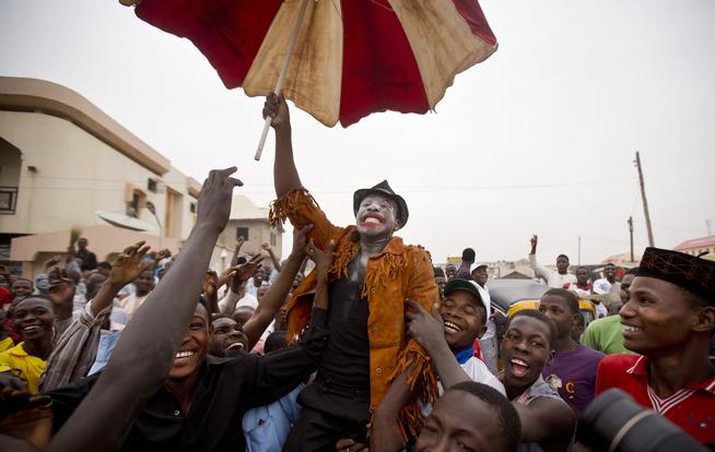 [/media-credit] A supporter of opposition candidate Muhammadu Buhari, dressed to represent and mock Nigeria President Goodluck Jonathan, celebrates Buhari’s anticipated electoral victory in Kano, Nigeria. (Ben Curtis, The Associated Press)