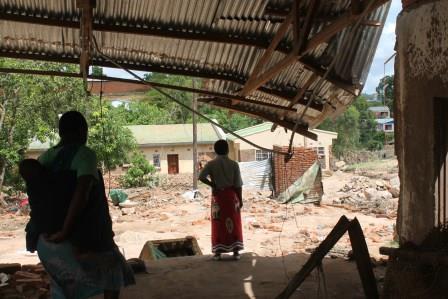 Brushing this thought aside, the other teacher, a plumpish smiley woman in shaded glasses named Rita, walked us to the area where the floods had passed the previous week. As we stood, speechless, staring at the remains of an iron sheet roof hanging over what used to be a sitting room, Rita added, as if for dramatic effect, “There was never a ‘river’ here. The floods created this river and swept away 12 houses.”